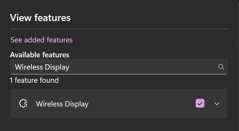 In Added features search bar search for: Wireless Display. If the feature is not found then you must add it by selecting: See available features